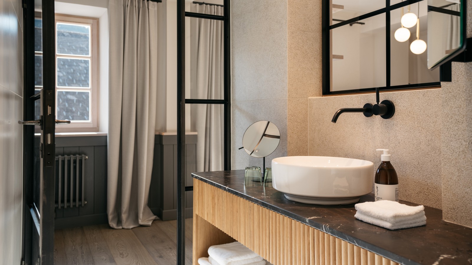 Im Boutique Hotel Refugium Lunz gleicht kein Zimmer dem anderen. Hier ist der Waschplatz offen in den Raum integriert.
