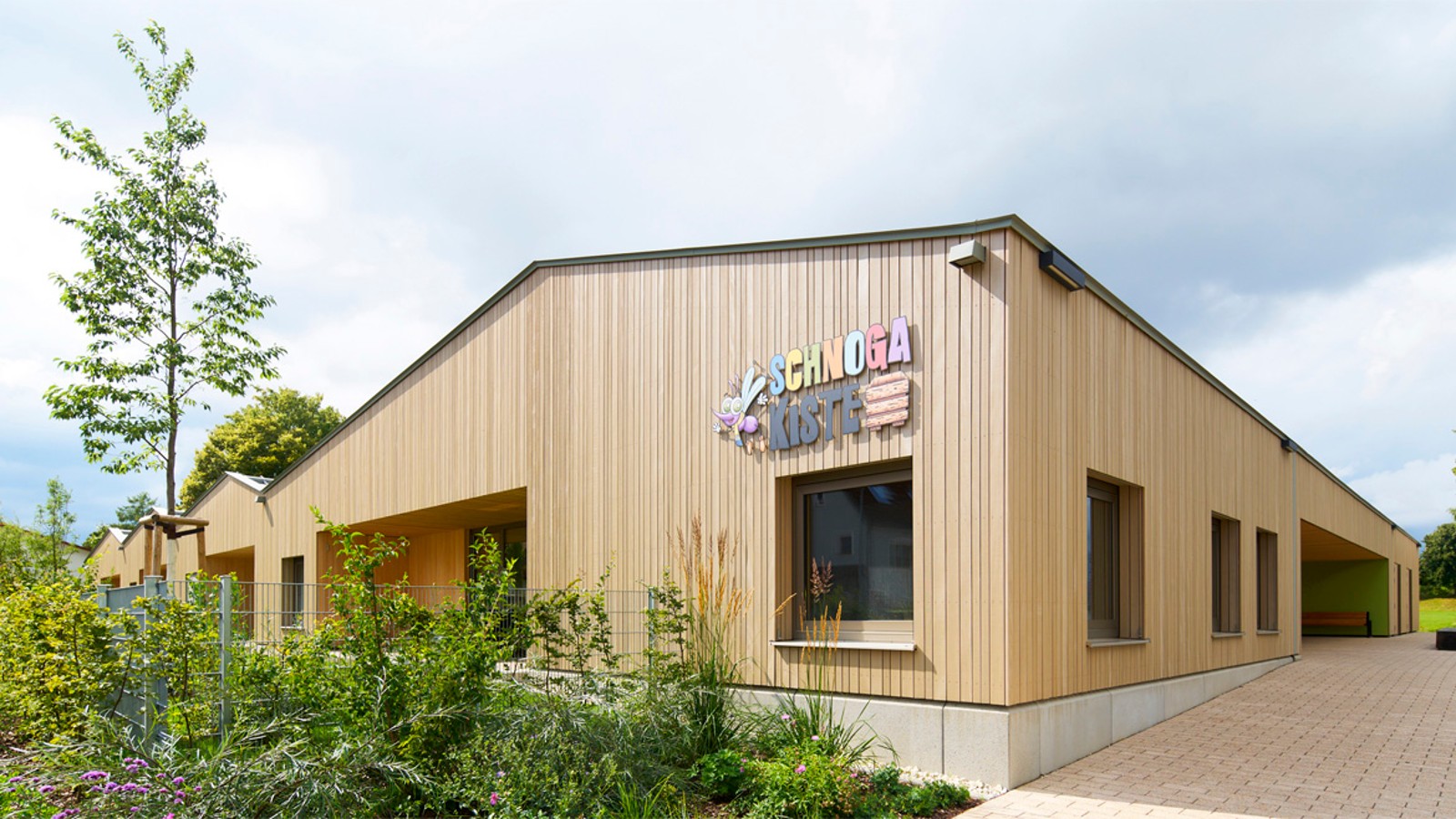 Das Außenfoyer der Kita „Schnogakiste“ ist mehr als ein sicherer Spielbereich: Die Holzbauweise schafft eine warme, einladende Atmosphäre, in der Kinder sich frei bewegen, entdecken und erleben können.